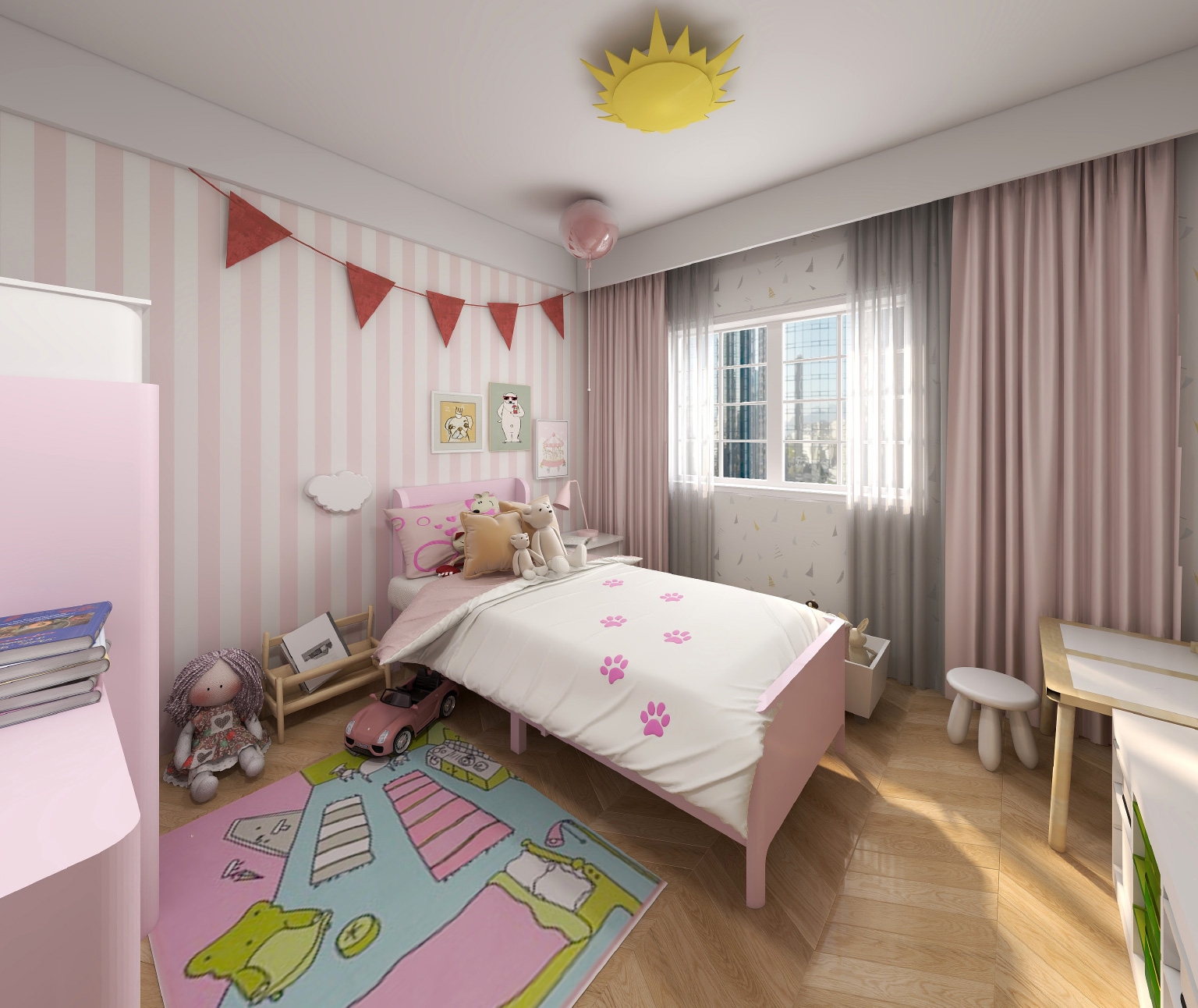 儿童房可爱温馨,充满了活力和童真!浅粉色很少女,又不张扬。黄色的太阳灯很有张力。所有的颜色搭配都是孩子喜欢的。