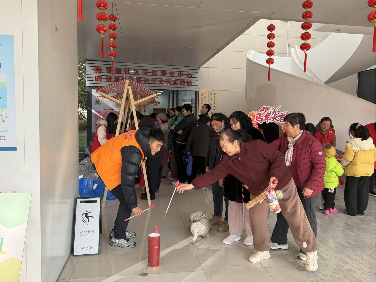 趣味互动区的投壶游戏同样备受欢迎。居民们手持箭矢,瞄准壶口轻轻投掷,投中的居民欢呼雀跃,未投中的也不气馁,继续尝试,现场欢声笑语不断。大家在轻松愉快的游戏中增进了交流,收获了快乐,邻里间的距离也在一次次互动中悄然拉近。