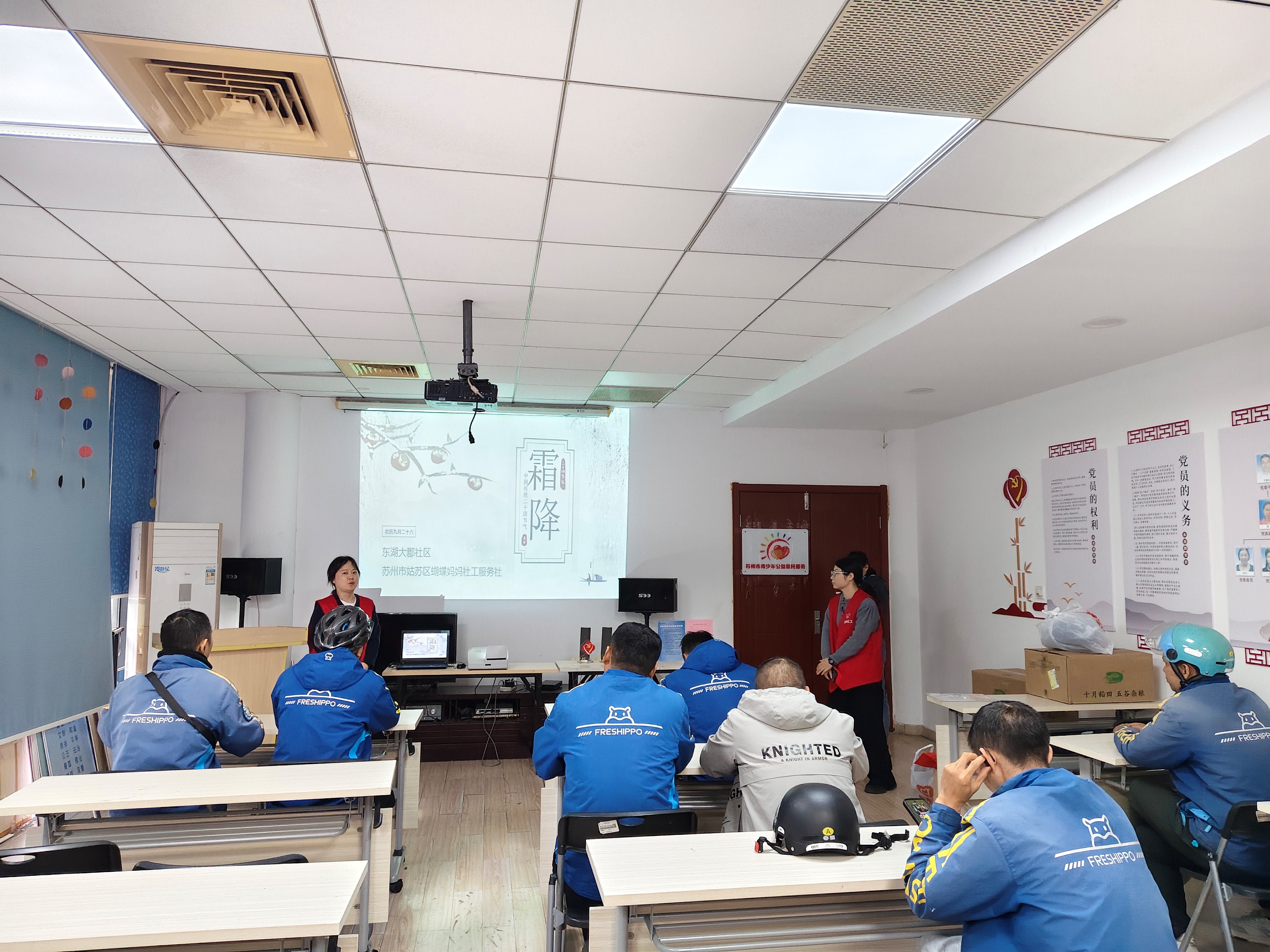 秋意渐深,霜降将至。2025年10月21日下午,由蝴蝶社工联合东湖大郡社区精心策划的“霜降护‘新’”主题关怀活动,在东湖大郡社区居委会温情启幕。此次活动就像一场及时雨,为新业态新就业群体带来了物质与精神的双重慰藉,向这些风雨兼程的城市守护者致以最崇高的敬意。