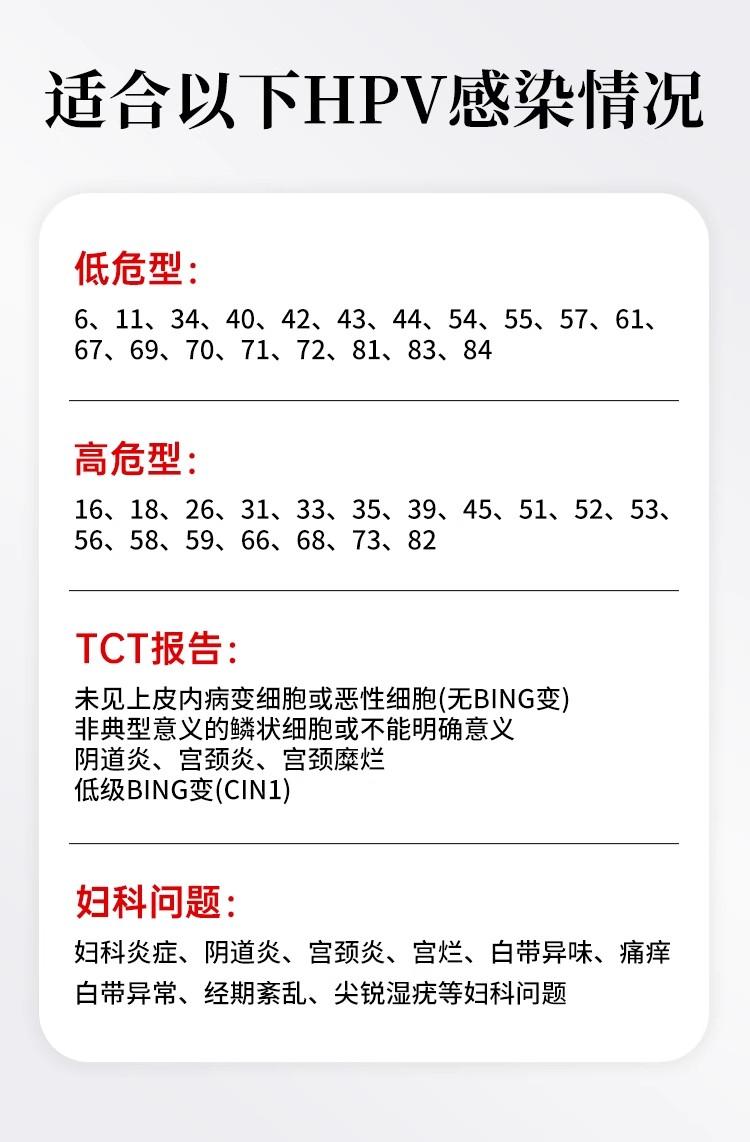 临床验证:产品已在多家妇幼机构临床应用,累计超10万例患者使用,其中超90%的高危HPV患者在3个月疗程后转阴;